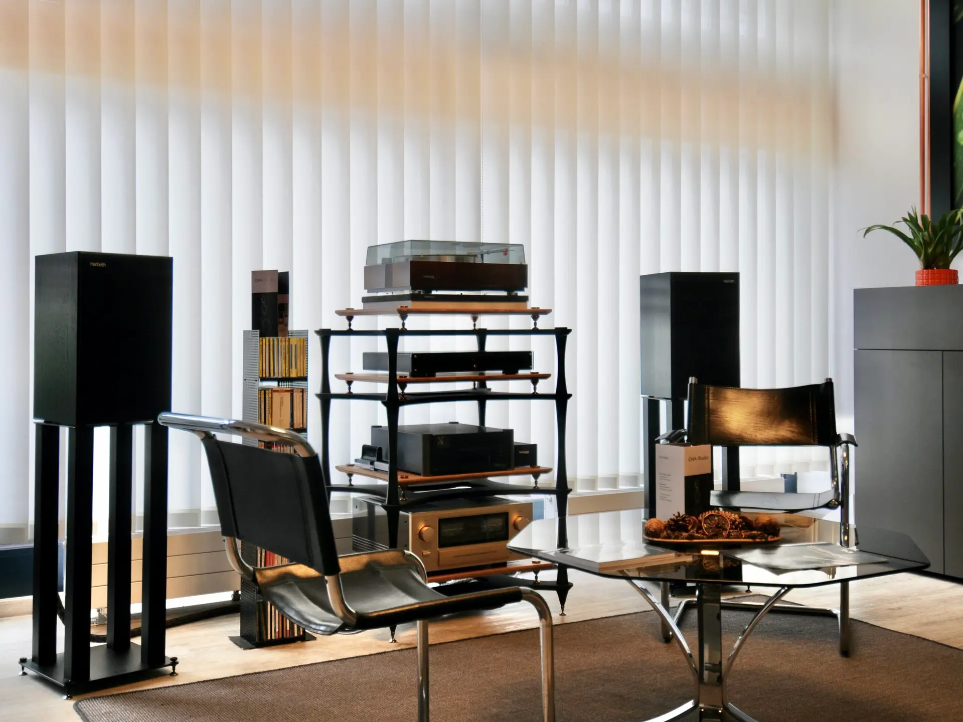 Der Empfangsraum des OHA-Studios, mit einer Größe von knapp 30 Quadratmetern, lädt mit seiner angenehm, lebendigen Klangcharakteristik zum ausgedehnten Musikgenuss ein. Von der Decke abgehängte Design-Lautsprecher von Gallo Acoustics, made in Italy, sorgen für hochwertige Hintergrundbeschallung. Eine weitere Möglichkeit im Klangraum Eins bieten Wandlautsprecher, welche sich besonders platzsparend in den Wohnraum integrieren lassen. Die klassische Stereoanlage mit mittig platziertem HiFi-Rack ist das Mittel der Wahl, wenn es etwas mehr sein darf.