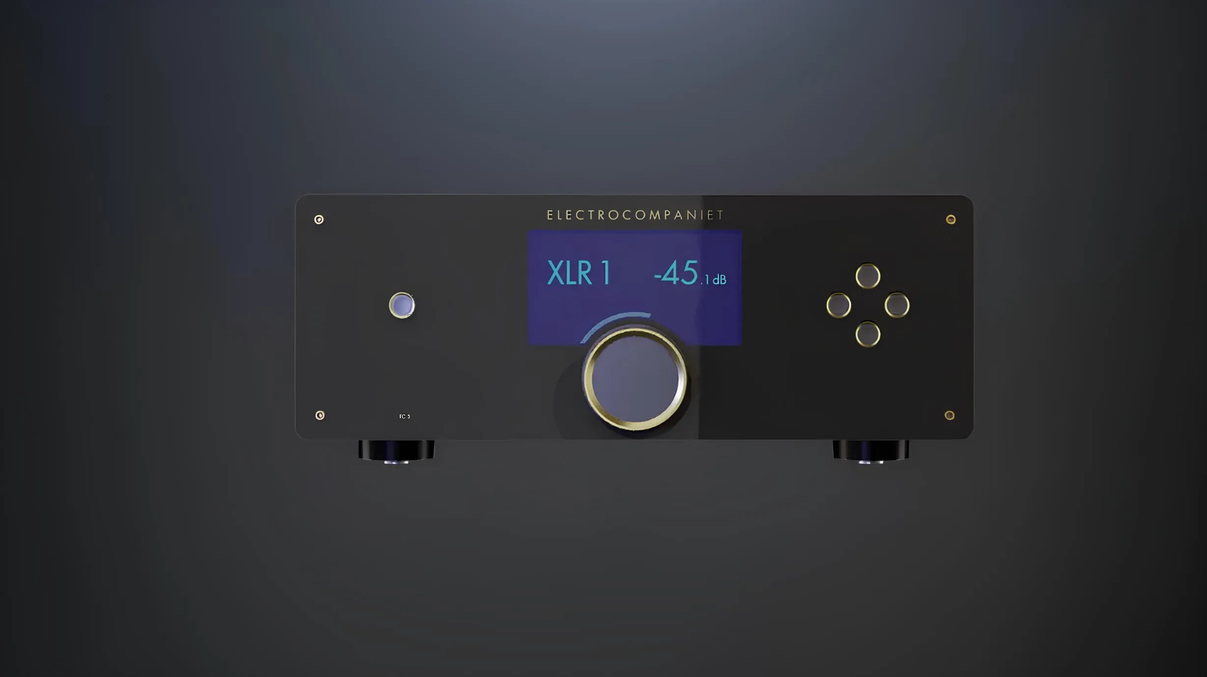 Auf der Front befindet sich der charakteristische große Electrocompaniet-Lautstärkeregler sowie ein 7-Zoll-Farbdisplay für Eingang, Lautstärke und Systeminformationen. Ergänzt wird dies durch direkte Bedientasten für Lautstärke und Eingangswahl.